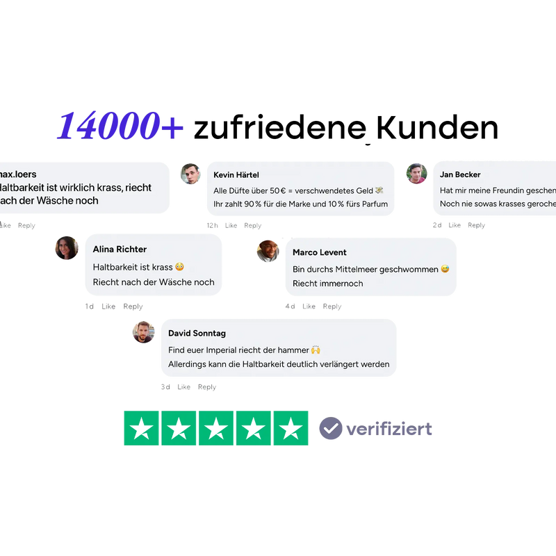 Überleg mal: Mit unserer 30-Tage-Geld-zurück-Garantie kannst du absolut nichts verlieren. Wenn wir nicht das halten, was wir versprechen, schickst du den Flakon einfach zurück. Tausende Kunden haben bereits gemerkt, dass die Düfte ihre Erwartungen teils übertreffen – schau dir unsere Bewertungen an. So oder so: Kein Risiko, nur die Chance, dich in einen traumhaften Duft zu verlieben.